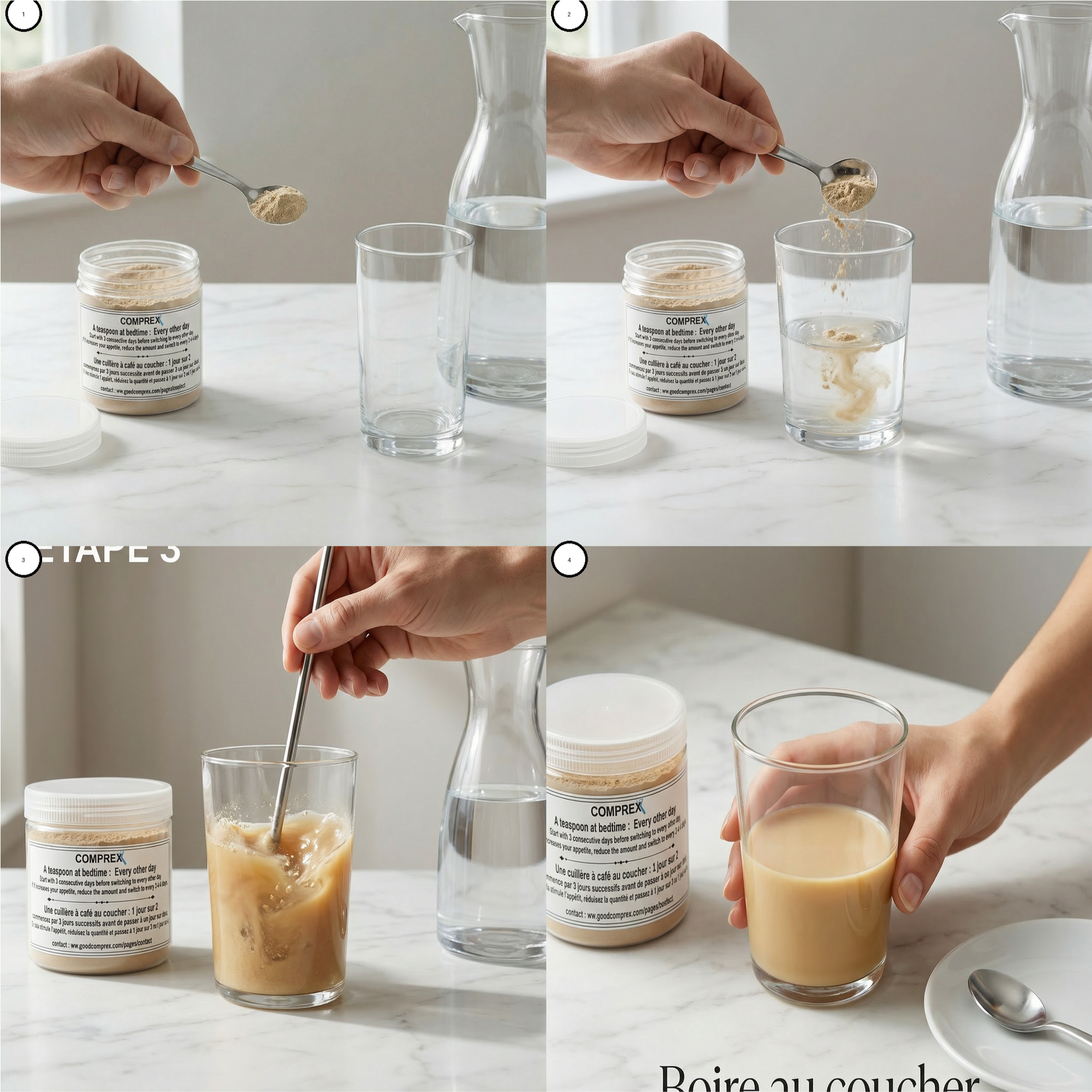 - Take one teaspoon of Comprex powder mixed with warm water, every other night before bed.